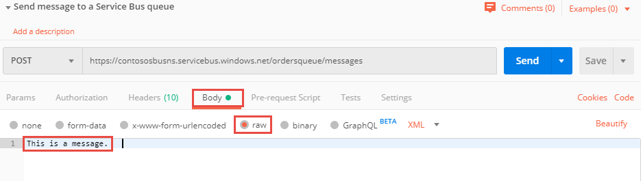 This is a messageor any message for the body.Select Send to send the message to the queue. You see the status as