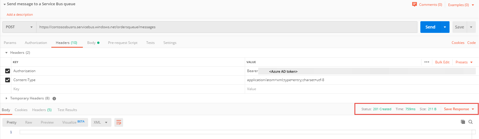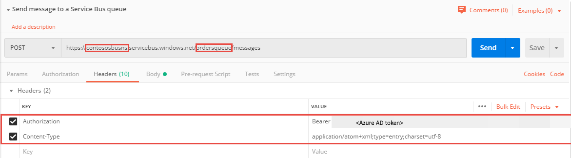 https://<SERVICE BUS NAMESPACE NAME>.servicebus.windows.net/<QUEUE NAME>/messages. Replace<SERVICE BUS NAMESPACE NAME>with the name of the Service Bus namespace. Replace<QUEUE NAME>with the name of the queue.On the Headers tab, add the following two headers.