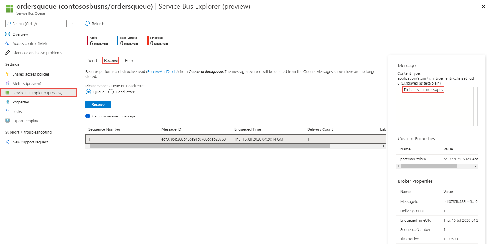 You can also use the Service Bus Explorer (preview) on the Service Bus Queue page as shown in the following image to receive or peek messages.