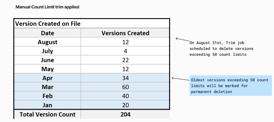 Example: In the following example, a trim job is queued to delete versions that exceed 50 major version counts. On August 31, the job starts permanently deleting older versions that exceed the 50 major version count limit as of August 31.