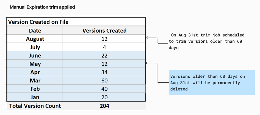 Example: In the following example, a trim job is queued to trim versions older than 60 days. On August 31, the job is picked up and it starts permanently deleting versions older than 60 days as of August 31.