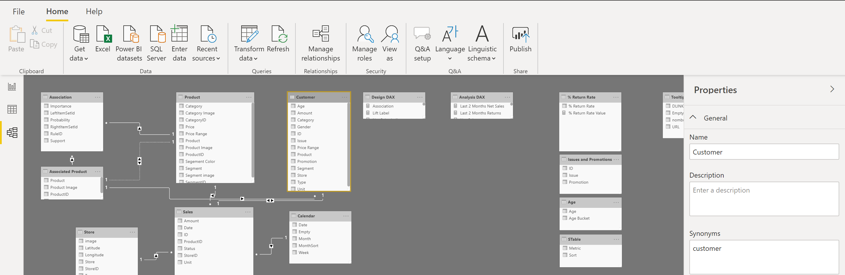 On the Model tab, you can edit specific column and table properties by selecting a table or columns, and you can transform the data by using the Transform Data button, which takes you to Power Query Editor. Additionally, you can manage, create, edit, and delete relationships between different tables by using Manage Relationships, which is located on the ribbon.