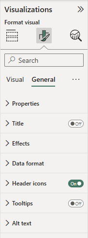 All report objects have some properties in common, which can be set in various sections of the Format options. Commonly applied settings include general properties (location, size, and alt text), title, and effects (background, border, shadow, and more).