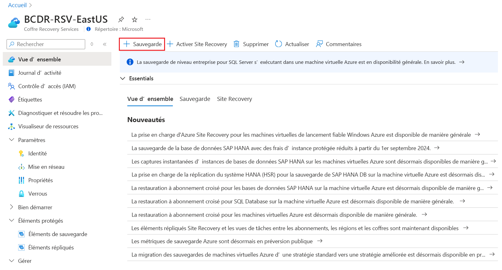 Dans le portail Microsoft Azure, accédez au coffre Recovery Services, puis sélectionnez + de sauvegarde.