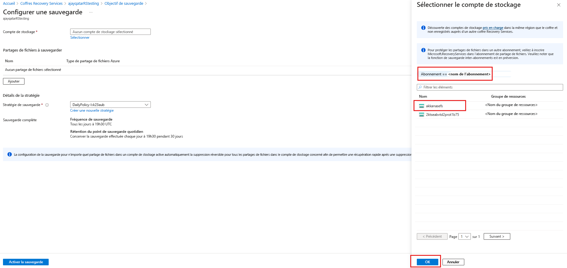Si vous souhaitez configurer l’opération de sauvegarde avec un compte de stockage dans un autre abonnement (sauvegarde inter-abonnements), choisissez l’autre abonnement à partir du filtre Abonnement . Les comptes de stockage de l’abonnement sélectionné apparaissent.
