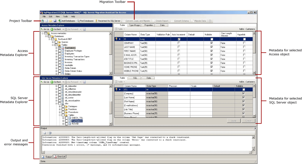 Après avoir installé SSMA, il est utile de vous familiariser avec l’interface utilisateur SSMA avant d’utiliser l’outil pour migrer des bases de données Access vers SQL Server ou Azure SQL Database. Le diagramme suivant montre l’interface utilisateur SSMA, notamment les explorateurs de métadonnées, les métadonnées, les barres d’outils, le volet de sortie et le volet liste d’erreurs :