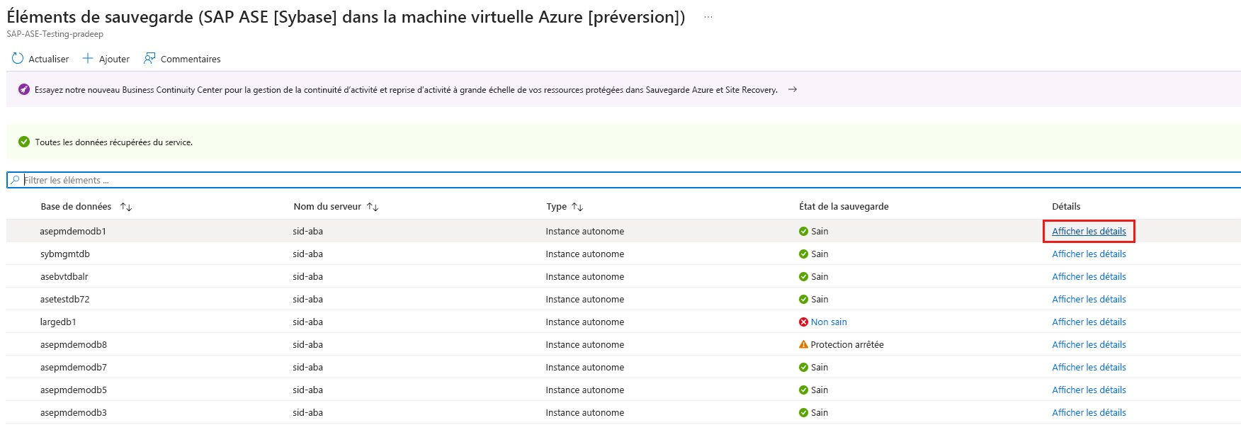 Dans le volet Éléments de sauvegarde , sélectionnez Afficher les détails de la base de données pour effectuer des opérations telles que la sauvegarde ou la restauration.