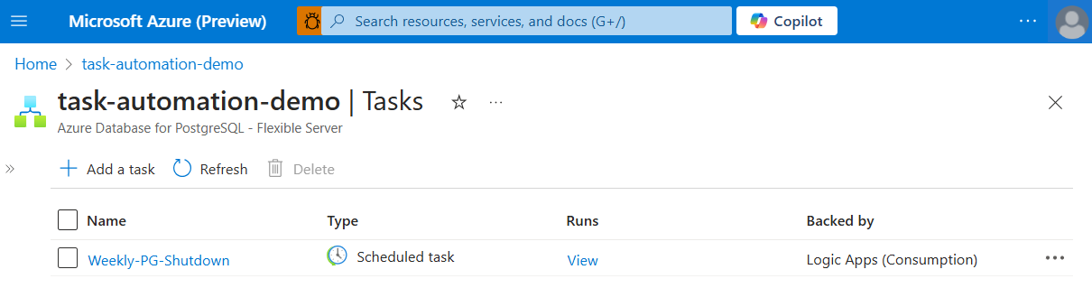 Dans le menu de navigation de la ressource, dans la section Automatisation, sélectionnez Tâches.