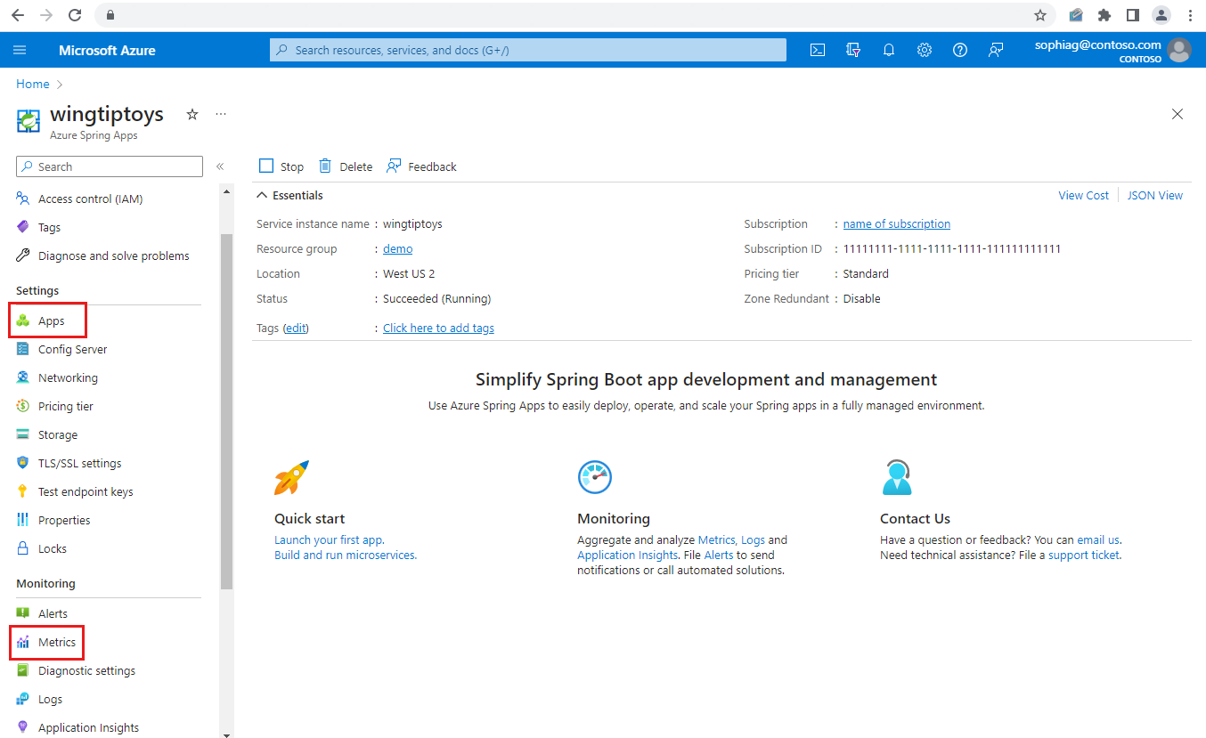 Capture d’écran du Portail Azure montrant la page de vue d’ensemble d’Azure Spring Apps avec les applications et les métriques mises en évidence dans le volet de navigation.
