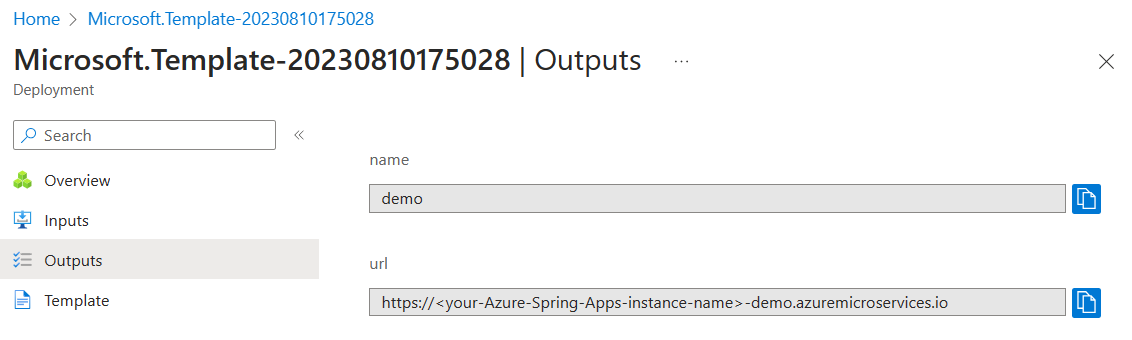 Une fois le déploiement terminé, procédez comme suit pour trouver l’URL de l’application à partir des sorties du déploiement :