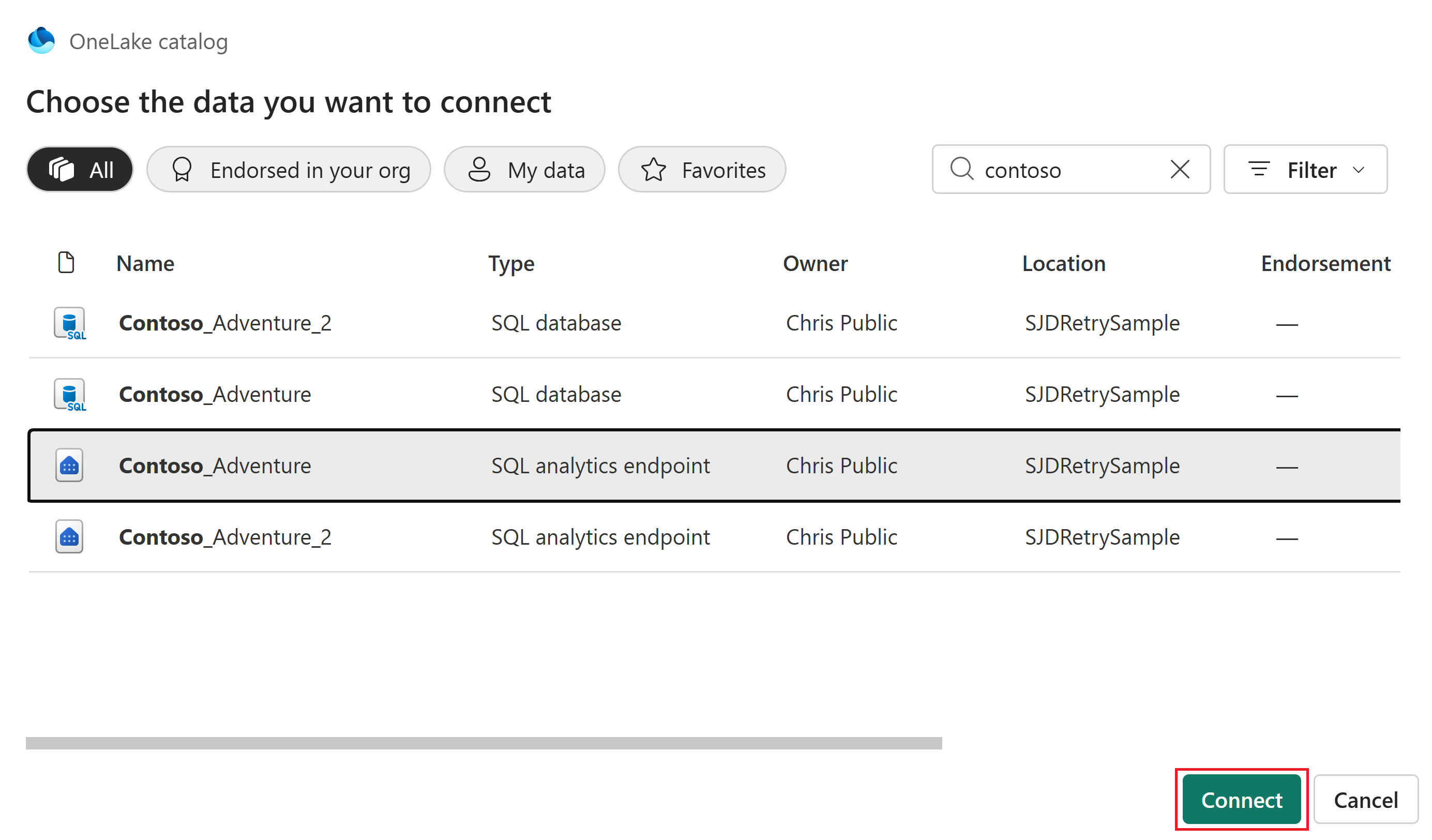 Dans le catalogue OneLake, choisissez la source de données à laquelle vous souhaitez vous connecter. Sélectionnez Filtrer pour afficher uniquement des types spécifiques de sources de données Fabric ou effectuer une recherche par mot clé spécifique. Lorsque vous êtes prêt, sélectionnez Se connecter.