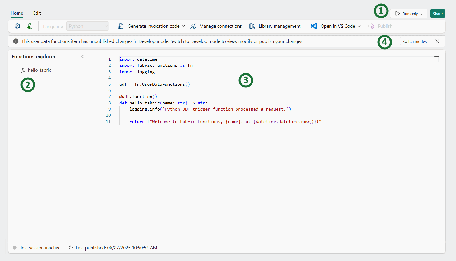 Fabric User Data Functions fournit deux modes pour interagir avec vos fonctions dans le portail Fabric : développer le mode et exécuter/afficher uniquement. Vous trouverez le sélecteur de mode dans le coin supérieur droit de votre page Fonctions de données utilisateur.
