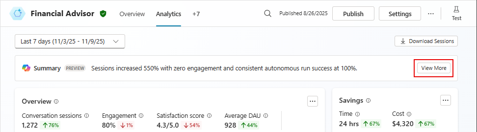 La zone Résumé utilise Copilot pour générer un résumé d’intelligence artificielle des insights clés sur votre agent. Sélectionnez Afficher plus pour afficher la liste complète des insights.