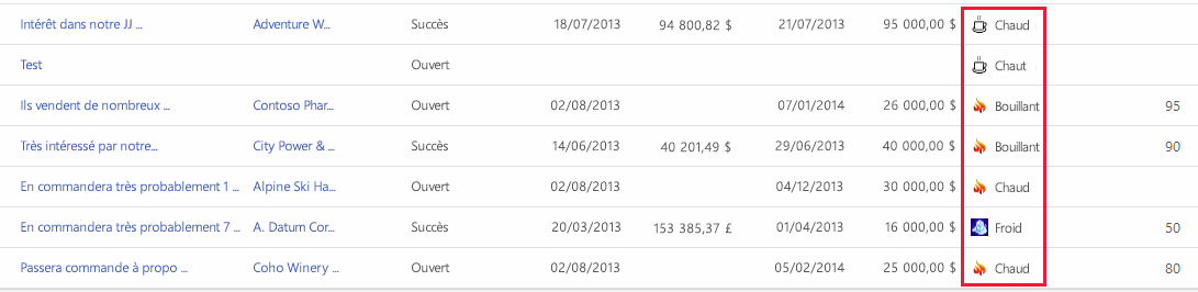 Cet exemple affiche des icônes personnalisées dans une vue de la table d’opportunités, disponible avec certaines applications, telles que Dynamics 365 Sales. Vous pouvez afficher des icônes personnalisées dans des vues avec d’autres tables standard, telles que la table des comptes ou des contacts, ainsi que des tables personnalisées.