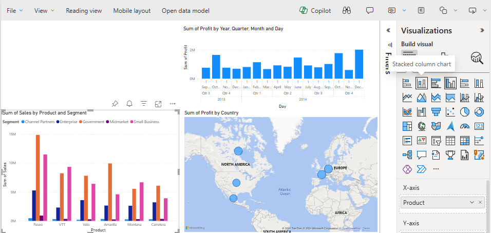 Dans le volet Données, sélectionnez les champs Ventes, Produit et Segment.