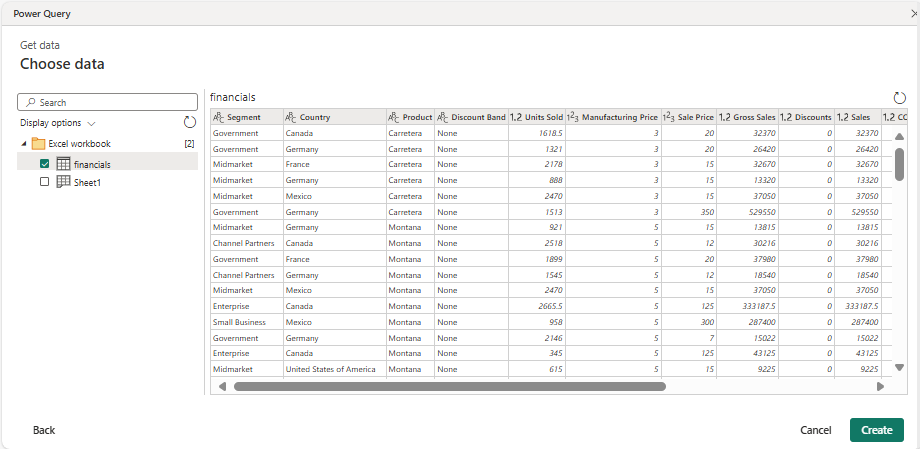 Dans la fenêtre Choisir des données Power Query, sélectionnez le tableau financier dans le classeur Excel, puis sélectionnez Créer.