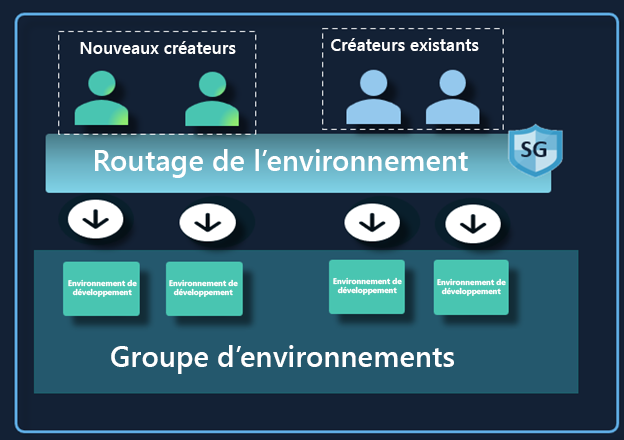 Diagramme montrant comment les créateurs nouveaux et existants s’intègrent dans le routage de l’environnement et le groupe d’environnements.