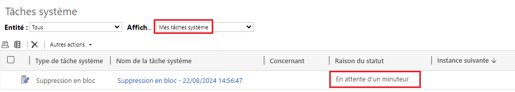 Lorsque vous supprimez des données en bloc, une tâche système de suppression en bloc est créée et peut être supprimée.