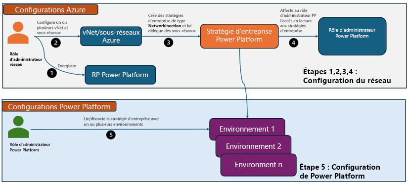 Le diagramme suivant montre les fonctions des rôles dans le processus d’installation pour la prise en charge du réseau virtuel dans un environnement Power Platform.