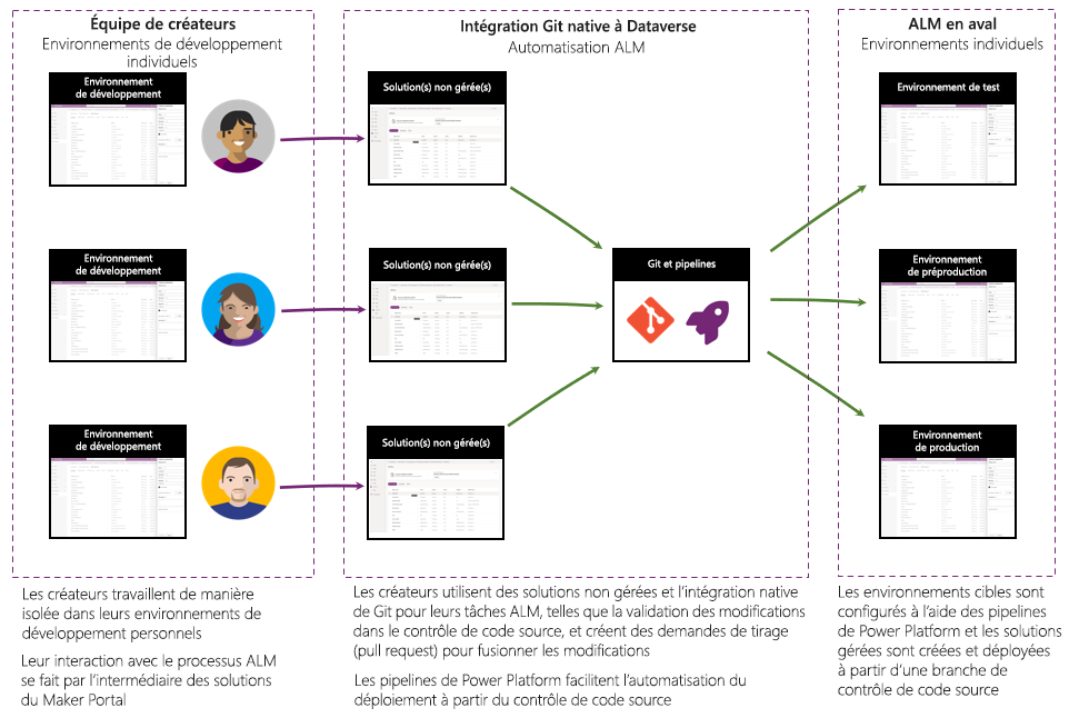 Power Platform fournit de nombreuses fonctionnalités prêtes à l’emploi qui permettent aux organisations de gérer la gestion du cycle de vie des applications (ALM) pour leurs solutions. Il est notamment possible d’empaqueter des solutions sous forme de conteneurs pour les différents types d’objets de la plateforme, de gérer les environnements impliqués dans le cycle de vie des applications et de déployer des solutions à l’aide de pipelines Power Platform. Il existe également plusieurs façons d’intégrer les référentiels Git à Power Platform l’aide d’outils de développement. Avec l’intégration native de Git dans Dataverse, le processus est simplifié et rationalisé pour que les créateurs puissent travailler avec leurs solutions de manière familière et interagir avec le contrôle de code source via des interfaces simplifiées dans Power Apps (make.powerapps.com).
