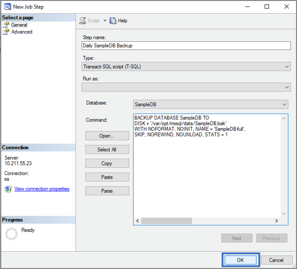SampleDB.EXECUTE sp_add_jobstep @job_name = N'Daily SampleDB Backup', @step_name = N'Backup database', @subsystem = N'TSQL', @command = N'BACKUP DATABASE SampleDB TO DISK = \ N''/var/opt/mssql/data/SampleDB.bak'' WITH NOFORMAT, NOINIT, \ NAME = ''SampleDB-full'', SKIP, NOREWIND, NOUNLOAD, STATS = 10', @retry_attempts = 5, @retry_interval = 5; GOCréez ensuite une planification quotidienne pour votre tâche avec sp_add_schedule.
