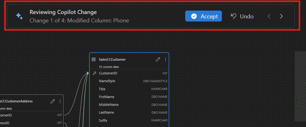 Lorsque GitHub Copilot applique plusieurs modifications de schéma, il démarre automatiquement la révision Modifications Copilot. Ce flux guidé vous montre chaque modification proposée par l’IA afin de pouvoir les passer en revue un par un :