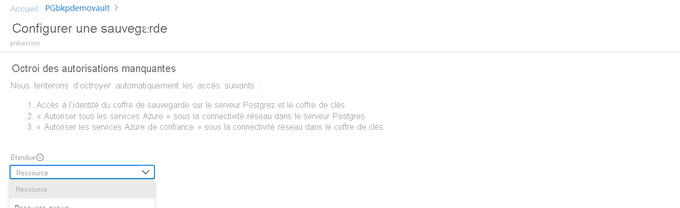 Cependant, avec cette option, Sauvegarde Azure n’a pas de visibilité sur le coffre de clés que vous avez référencé. Les autorisations d’accès sur le coffre de clés ne peuvent pas être accordées en ligne. Pour que l’opération de sauvegarde réussisse, l'administrateur de sauvegarde, ainsi que l'administrateur PostgreSQL et/ou l’administrateur du coffre de clés, doivent s’assurer que l’accès du coffre de sauvegarde sur le coffre de clés est accordé manuellement en dehors du flux de configurer la sauvegarde.