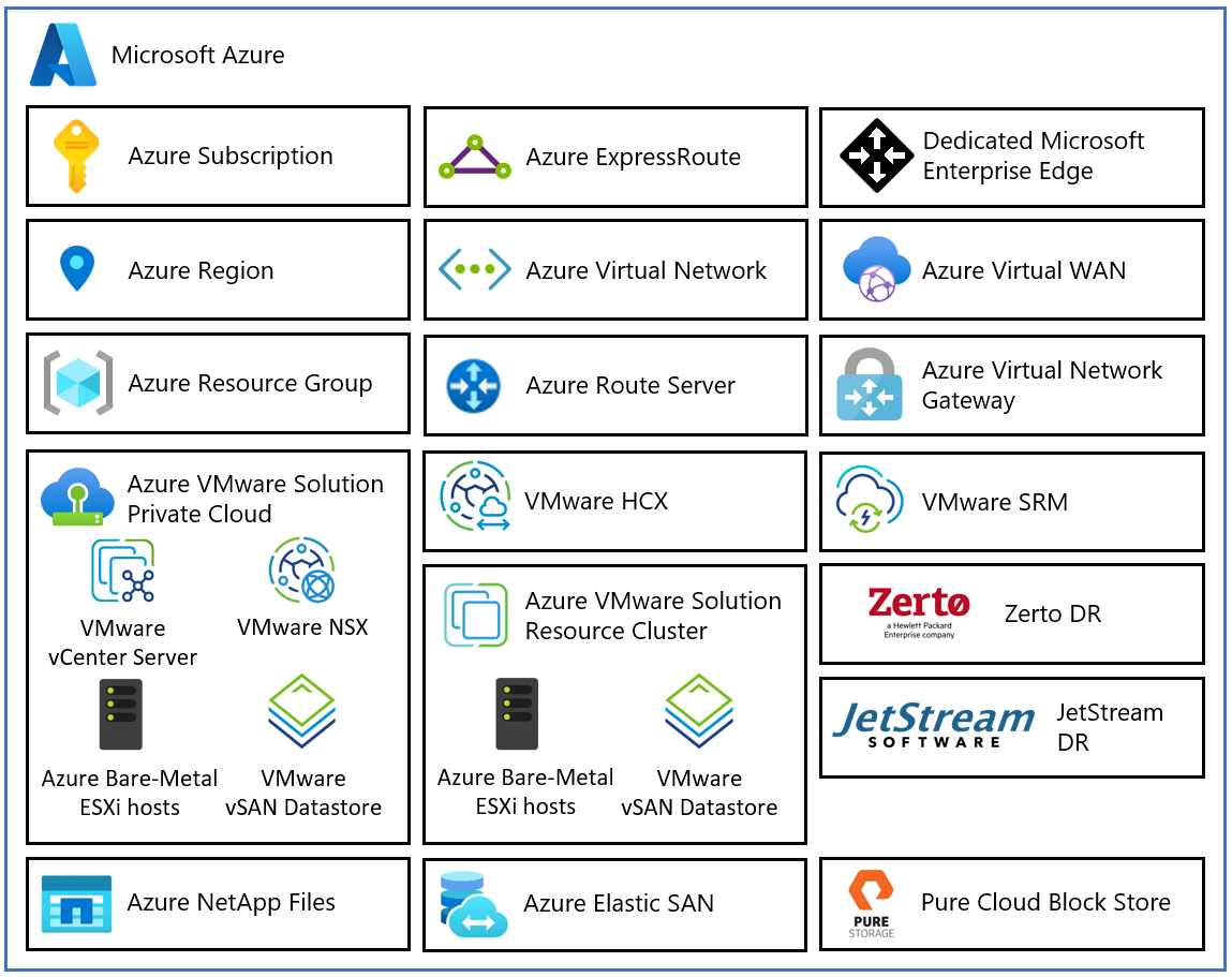 - Cluster de ressources Azure VMware Solution : fournit des ressources de calcul, de mise en réseau et de stockage pour les charges de travail client en étendant le cloud privé Azure VMware Solution à l’aide de logiciels VMware, y compris le stockage vSAN défini par le logiciel et les hôtes Azure bare-metal ESXi. Azure NetApp Files, elastic SAN et Pure Cloud Block Store sont également pris en charge.