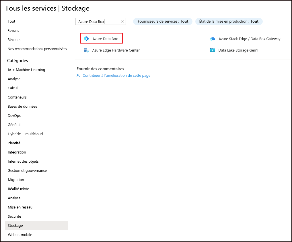 Dans le volet Tous les services, entrez Azure Data Box dans la zone de recherche, puis sélectionnez-le dans le résultat de la recherche.