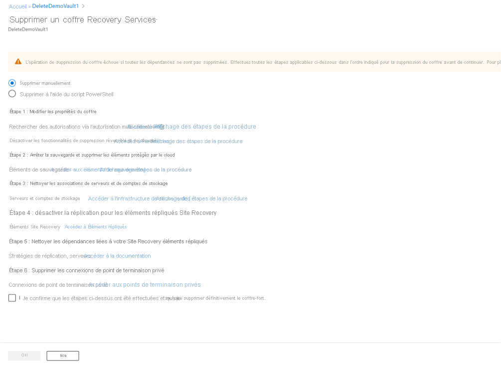 Vérifiez qu’aucun élément de sauvegarde, serveur de gestion de sauvegarde ni élément répliqué n’est listé. Si des éléments apparaissent encore dans le coffre, reportez-vous à la section Avant de commencer.
