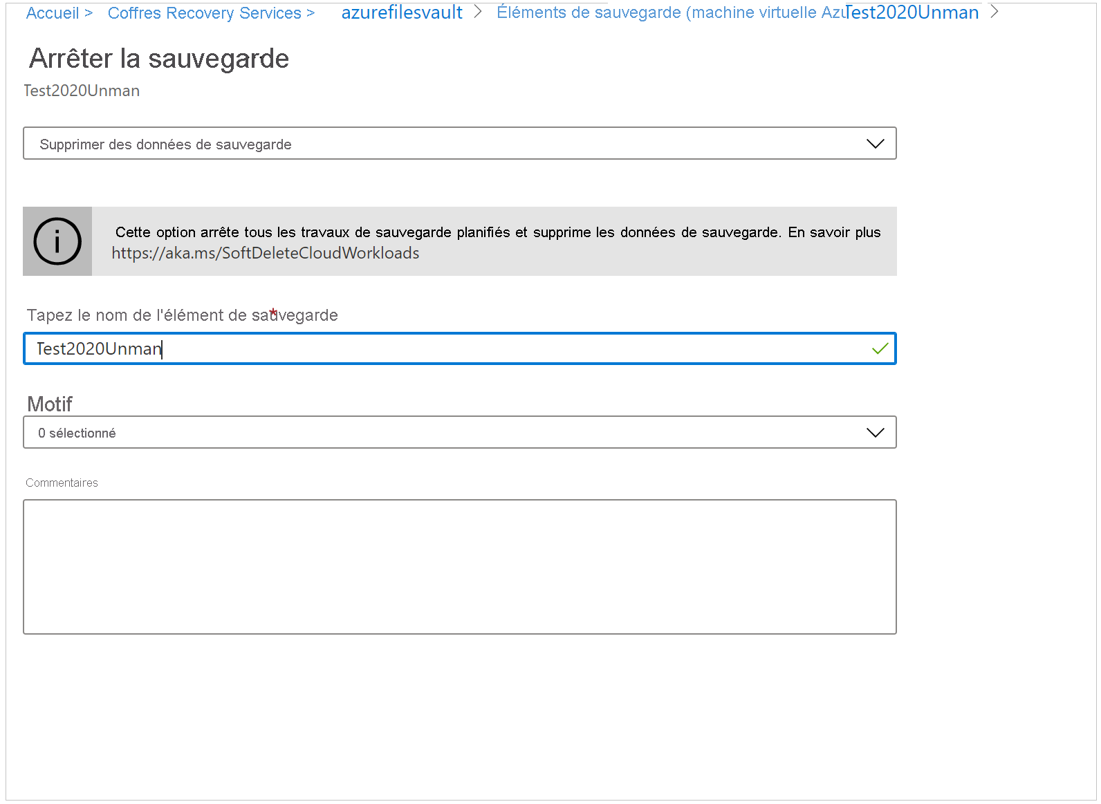 Si le volet Arrêter la sauvegarde s’affiche, sélectionnez Supprimer les données de sauvegarde dans le menu déroulant. Entrez le nom de l’élément de sauvegarde (ce champ respecte la casse), puis sélectionnez une raison dans le menu déroulant. Entrez vos commentaires, le cas échéant, puis sélectionnez Arrêter la sauvegarde.
