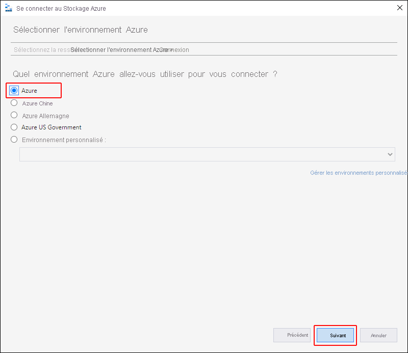 Dans le volet Sélectionner l’environnement Azure, sélectionnez un environnement Azure pour la connexion. Vous pouvez vous connecter à Azure global, à un cloud national ou à une instance d’Azure Stack. Sélectionnez ensuite Suivant.