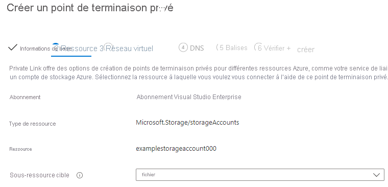 Confirmez que l’abonnement, le type de ressource et la ressource sont corrects, puis sélectionnez Fichier dans la liste déroulante Sous-ressources cible. Sélectionnez ensuite Suivant : réseau virtuel.
