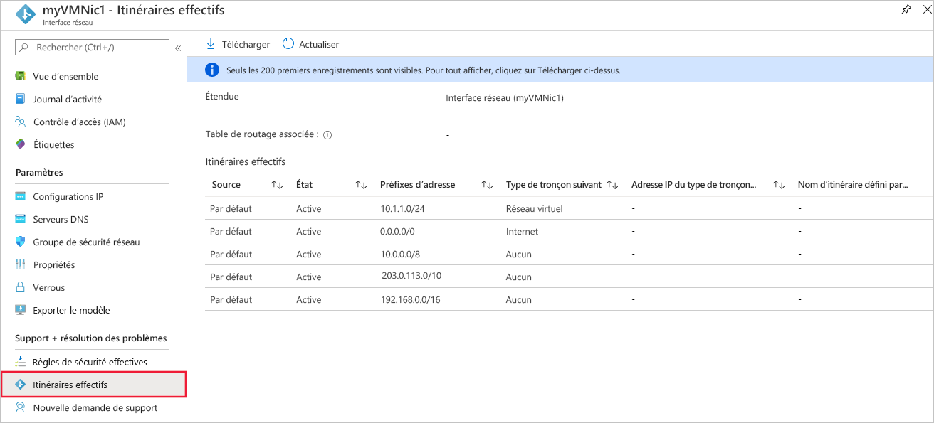 Sélectionnez l’interface réseau souhaitée pour afficher ses itinéraires effectifs. Chaque interface peut appartenir à un sous-réseau différent, ce qui entraîne des itinéraires uniques. L’exemple de l’image montre les itinéraires par défaut créés par Azure pour chaque sous-réseau. Votre liste inclut les itinéraires par défaut et peut également inclure des itinéraires supplémentaires. Les itinéraires peuvent provenir de fonctionnalités telles que le peering de réseaux virtuels ou les connexions à des réseaux locaux via une passerelle VPN Azure. Pour plus d’informations sur les itinéraires, consultez routage du trafic de réseau virtuel. S’il existe de nombreux itinéraires, utilisez l’option Télécharger pour les enregistrer en tant que fichier .csv pour faciliter la révision.
