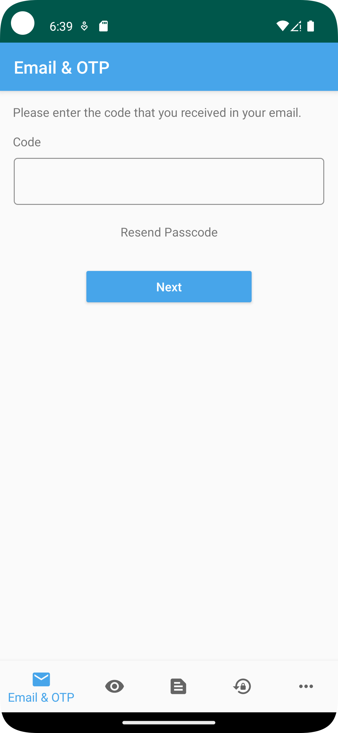 Sélectionnez le bouton Run. L’application ouvre l’écran Email &OTP .