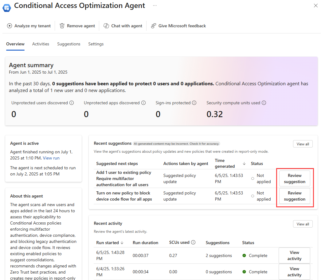 Lorsque la page vue d’ensemble de l’agent se charge, toutes les suggestions s’affichent dans la zone Suggestions récentes . Si une suggestion a été identifiée, vous pouvez passer en revue la stratégie, déterminer l’impact de la stratégie et appliquer les modifications si nécessaire. Pour plus d’informations, consultez Examiner et approuver les suggestions de l’agent d’accès conditionnel.