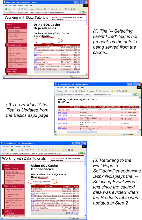 Après avoir configuré ObjectDataSource pour prendre en charge la mise en cache, revisitez la page via un navigateur. Là encore, le texte « Sélection de l’événement déclenché doit apparaître sur la première visite de page, mais doit disparaître lors de la pagination, du tri ou du clic sur les boutons Modifier ou Annuler. Cela est dû au fait qu’une fois les données chargées dans le cache ObjectDataSource, elles restent là jusqu’à ce que les ProductsCategories tables soient modifiées ou que les données soient mises à jour via GridView.