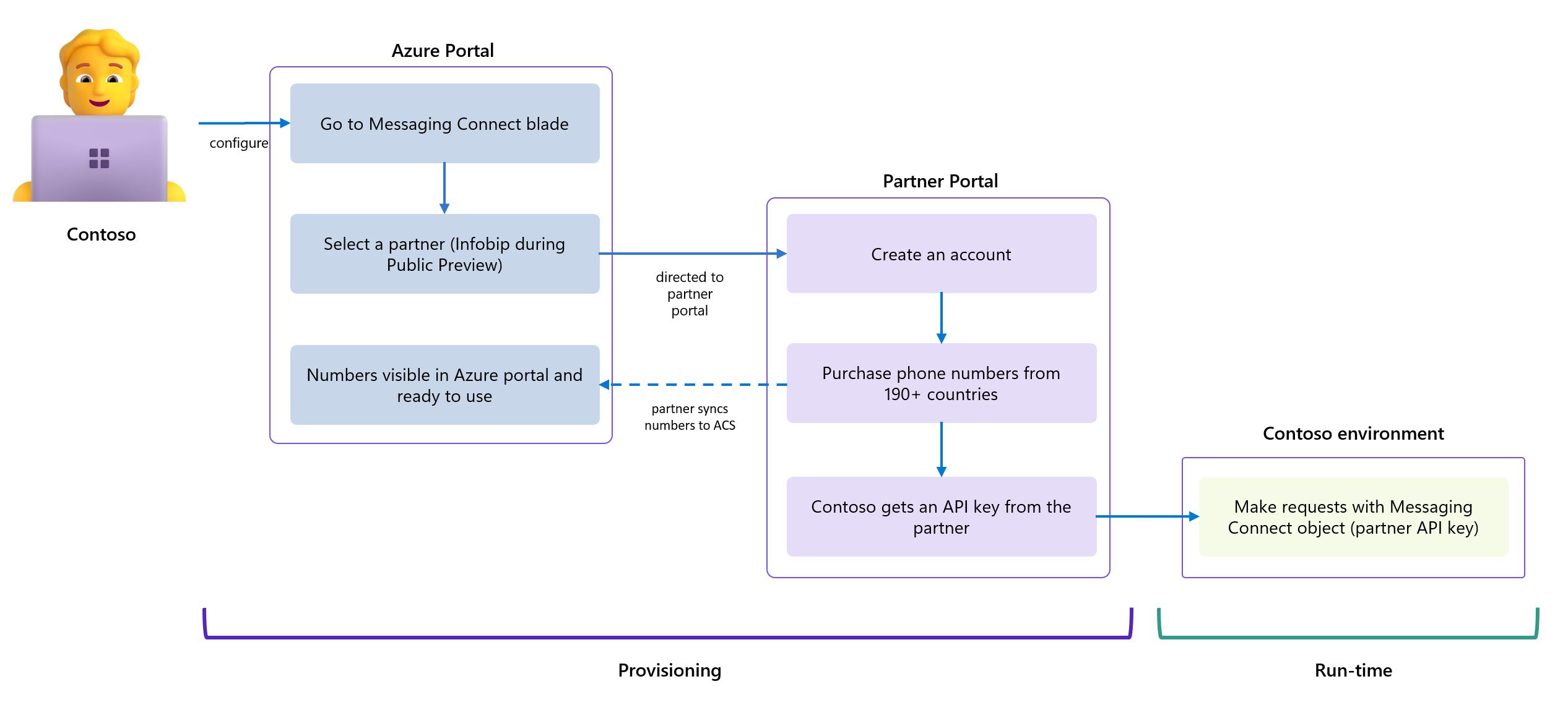 Messaging Connect introduit un nouveau modèle d’approvisionnement : au lieu d’obtenir des numéros directement à partir de Microsoft, vous les achetez via un partenaire approuvé, en commençant par Infobip, puis connectez-les à votre ressource Azure Communication Services. Ce processus vous permet d’accéder aux numéros SMS dans plus de 190 pays, tandis que le partenaire gère les flux de conformité, de documentation et d’approbation locaux.