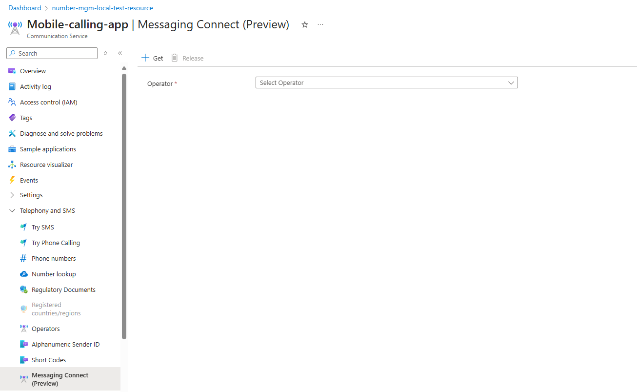 Lorsque vous recherchez un pays et un type de numéro dans le portail Azure, vous disposez de Messaging Connect en tant qu’option si Azure Communication Services ne prend pas en charge cette configuration directement. Vous terminez ensuite le processus d’approvisionnement via le portail du partenaire.