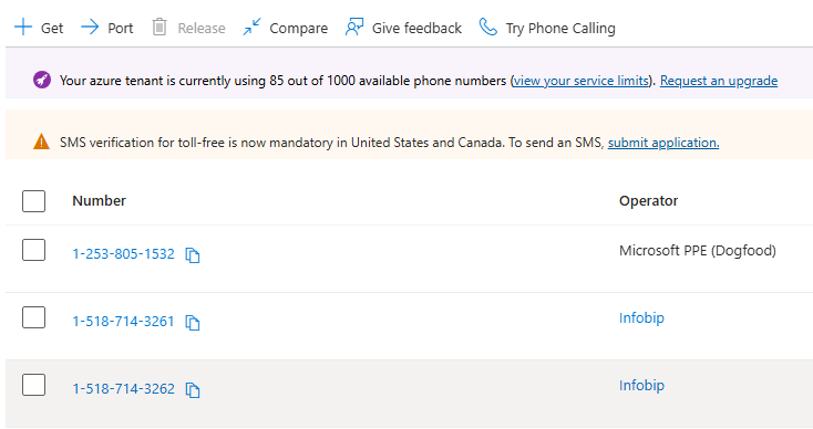 - Les numéros acquis via Messaging Connect s’affichent dans le portail Azure avec une étiquette « Nom de l’opérateur » afin de pouvoir les distinguer des numéros gérés par Azure Communication Services.