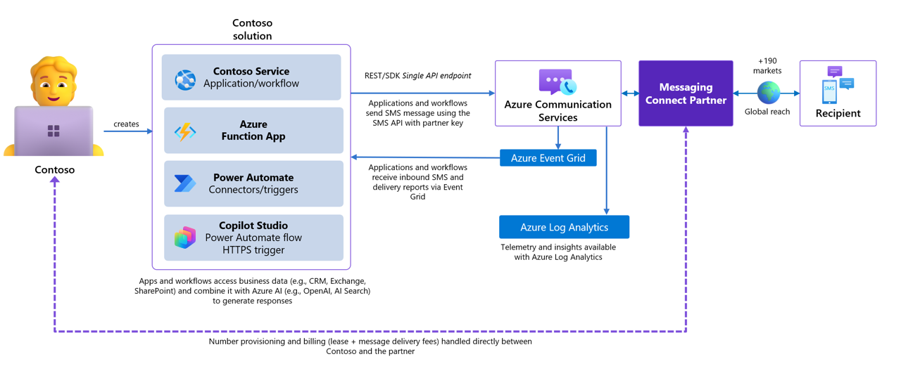 Au lieu de créer et de gérer des intégrations distinctes avec plusieurs fournisseurs, vous vous connectez une fois par le biais d’Azure Communication Services et routez le trafic vers des partenaires globaux. Le partenaire gère la location de numéros et la conformité. Les workflows de messagerie, d’observabilité et d’IA restent dans votre environnement Azure où vous créez, surveillez et mettez à l’échelle.