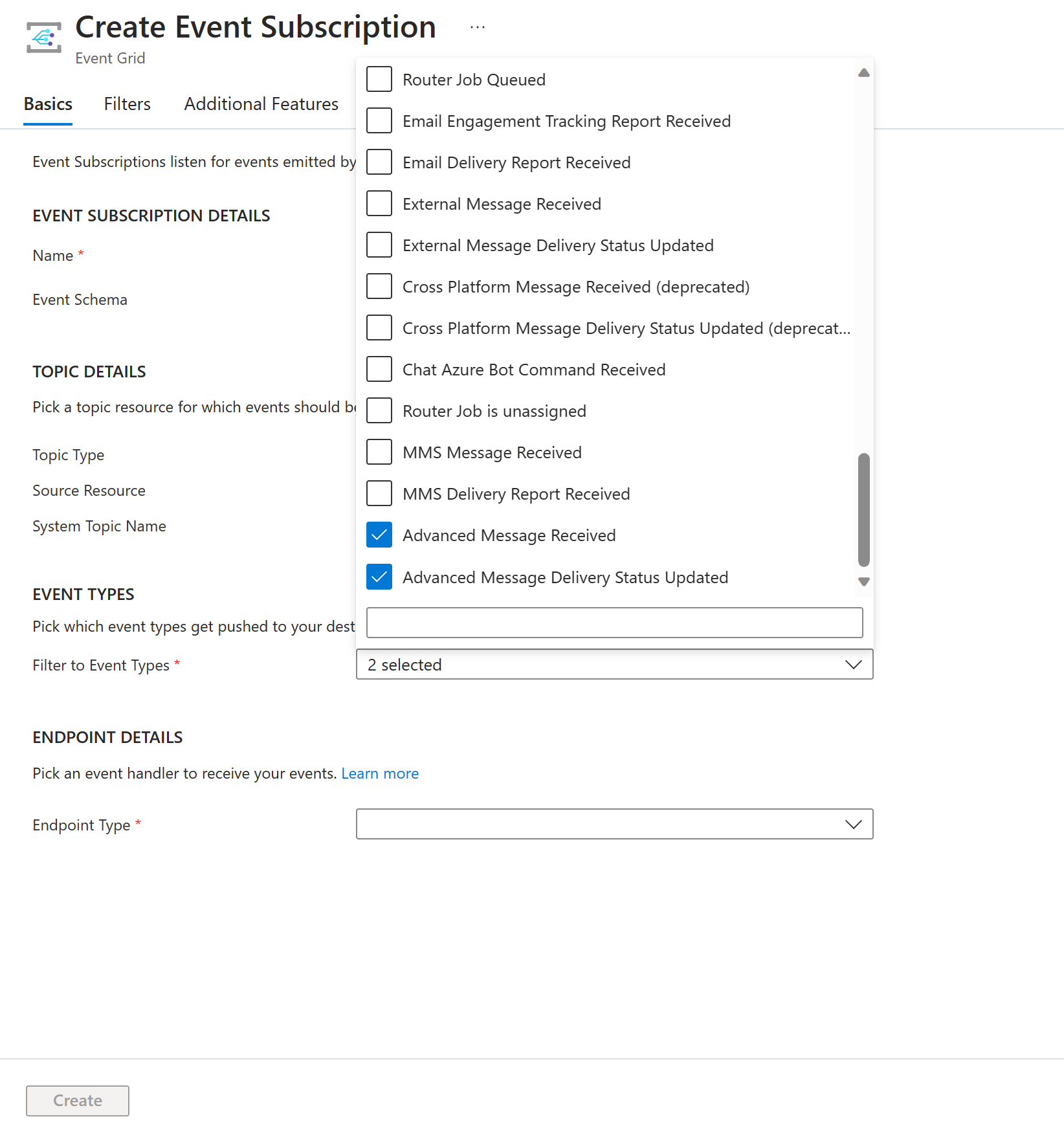 Types d’événements : sélectionnez les deux événements Messagerie avancés dans la liste.