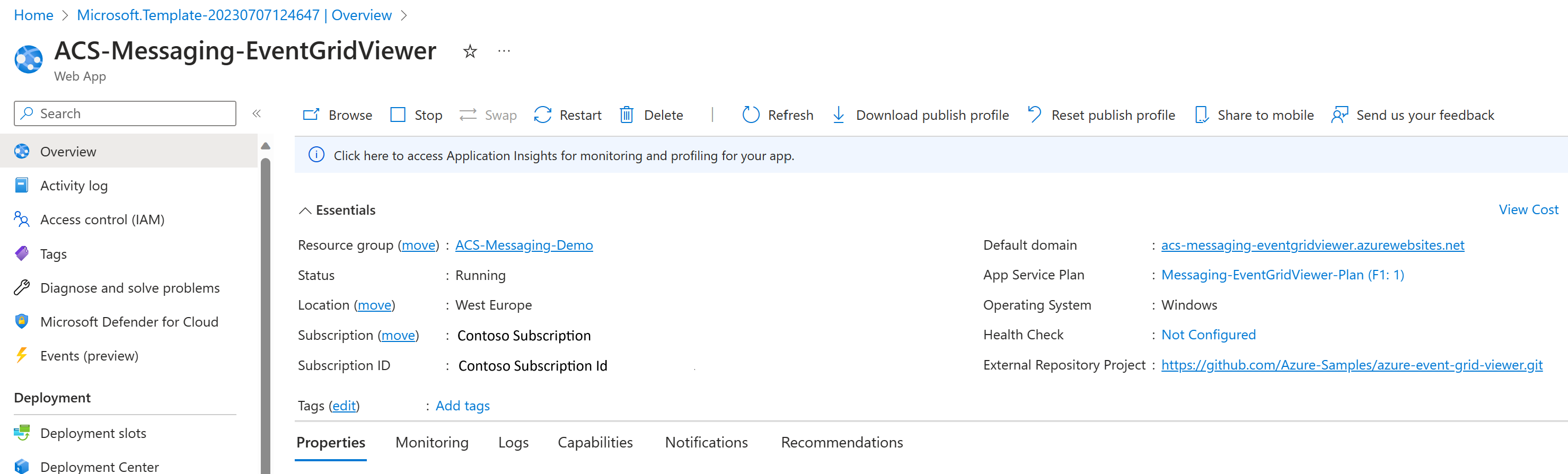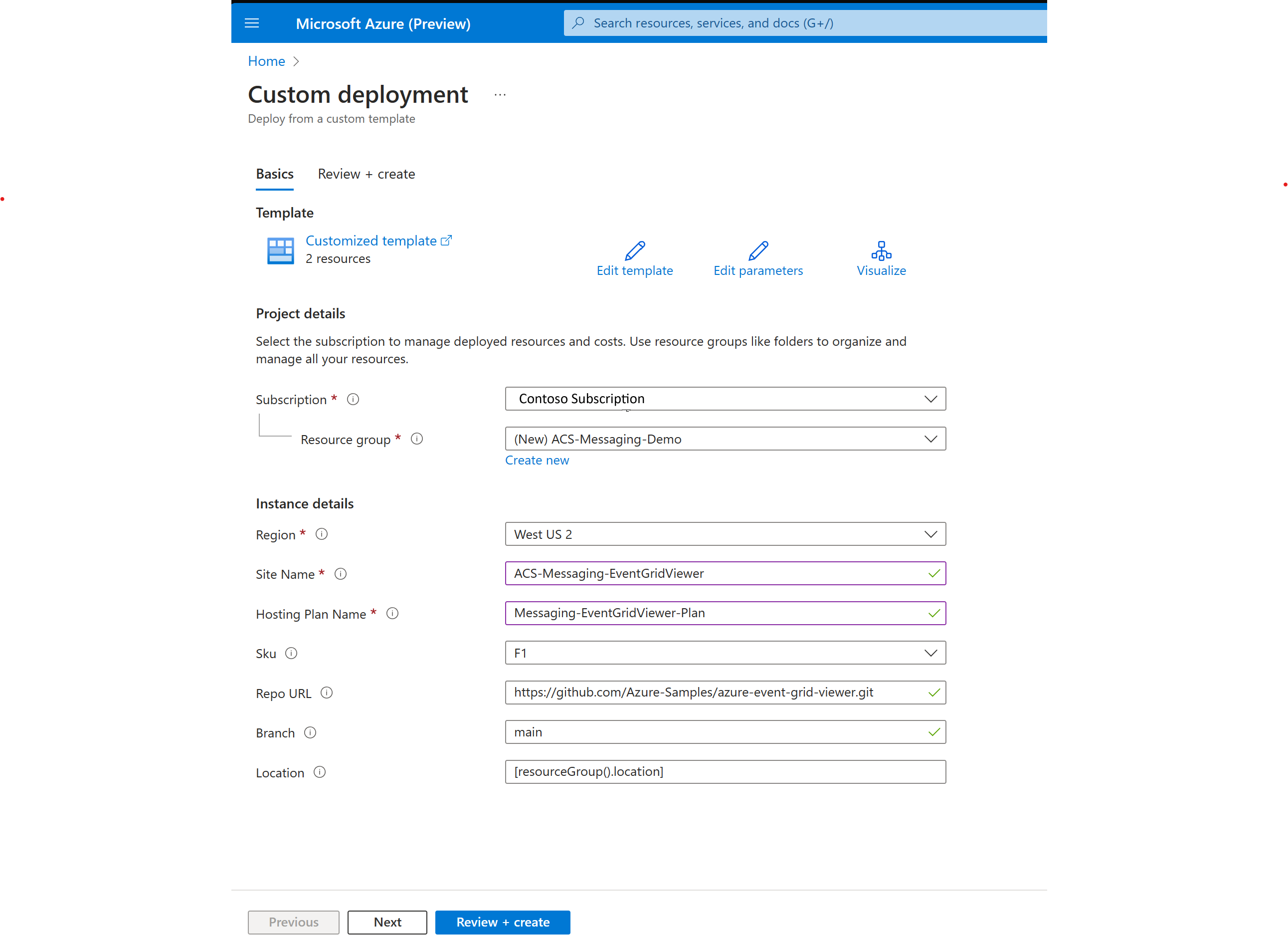 Subscription: sélectionnez l’abonnement qui contient votre ressource Azure Communication Services. Cet abonnement spécifique n’est pas obligatoire, mais il facilite le nettoyage une fois que le démarrage rapide est terminé.Resource Group: sélectionnez le groupe de ressources qui contient votre ressource Azure Communication Services. Ce groupe de ressources spécifique n’est pas obligatoire, mais il facilite le nettoyage une fois que le démarrage rapide est terminé.Region: sélectionnez le groupe de ressources qui contient votre ressource Azure Communication Services. Cette région spécifique n’est pas obligatoire, mais elle est recommandée.Site Name: créez un nom globalement unique. Ce nom de site est utilisé pour créer un domaine qui sera connecté à votre visionneuse Event Grid.Hosting Plan Name: créez un nom pour identifier votre plan d’hébergement.Sku: utilisez la référence SKU F1 à des fins de développement et de test. Si vous rencontrez des erreurs de validation lors de la création de votre visionneuse Event Grid indiquant qu’il n’y a plus de capacité pour le plan F1, essayez de sélectionner une autre région. Pour plus d’informations sur les références SKU, consultez la tarification App Service