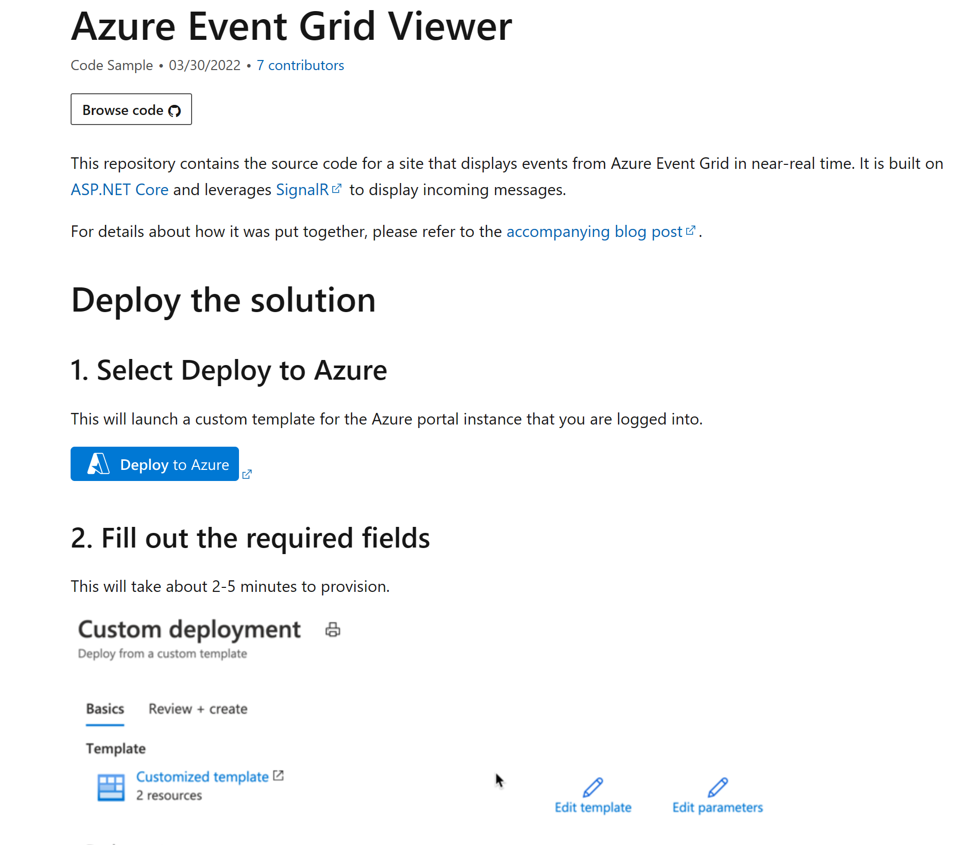 Accéder à ce lien Azure Event Grid Viewer : exemples de code | Microsoft Learn. Déployez l’exemple de visionneuse Event Grid en cliquant sur le bouton Déployer sur Azure.
