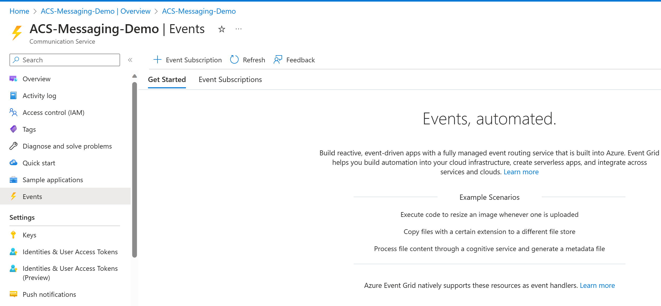 Ouvrez votre ressource Communication Services dans le portail Azure, accédez à l’option Événements dans le volet gauche, puis sélectionnez +Abonnement aux événements.
