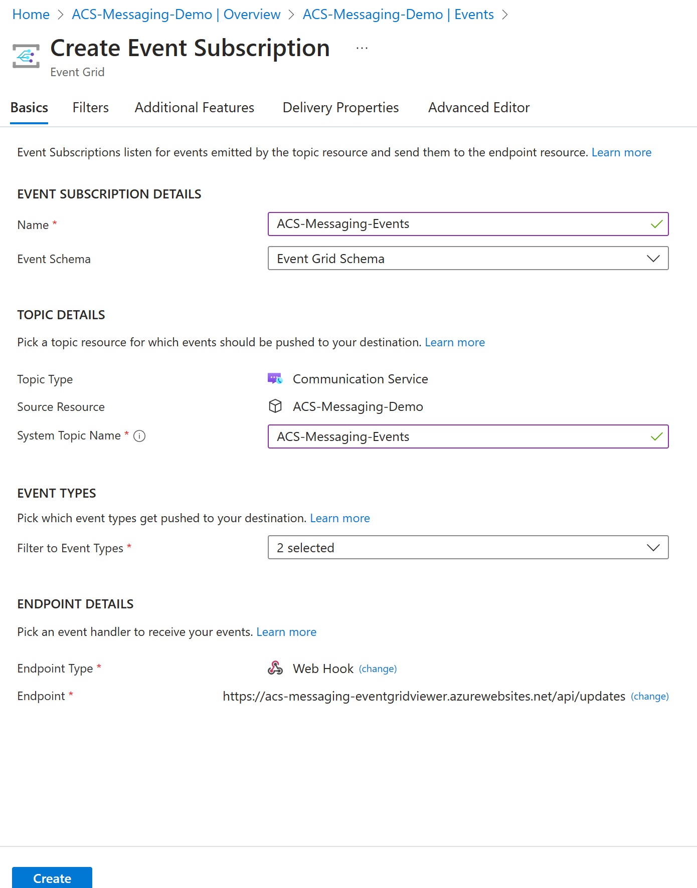 Type de point de terminaison : sélectionnez « Webhook » et entrez l’URL de la visionneuse Event Grid créée à l’étape Configurer la visionneuse Event Grid avec le chemin