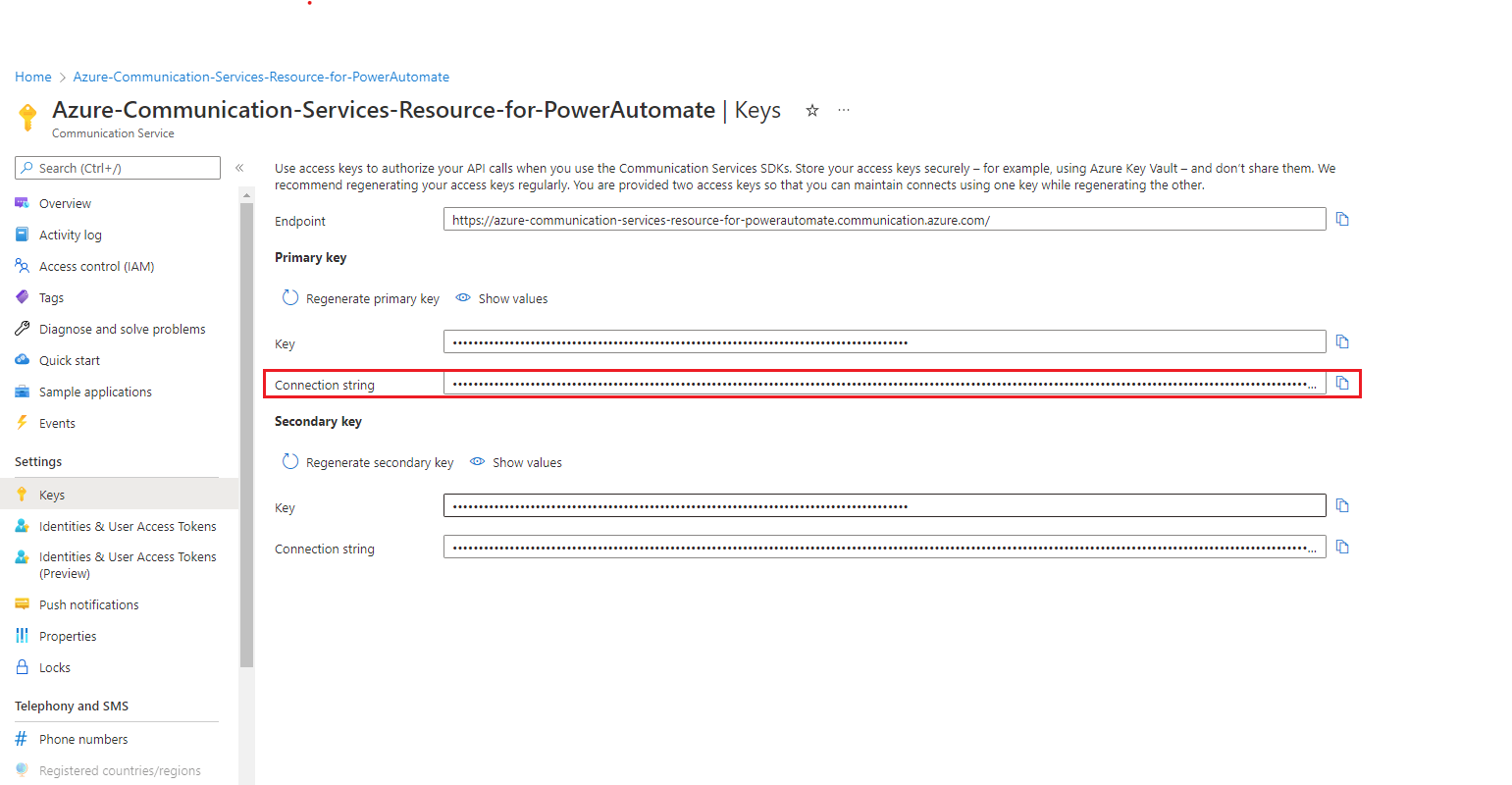 Fournissez la chaîne de connexion. Vous pouvez le trouver dans le portail Microsoft Azure, dans votre ressource Azure Communication Service. Sélectionnez l’option Clés dans le menu du volet gauche pour afficher la chaîne de connexion.