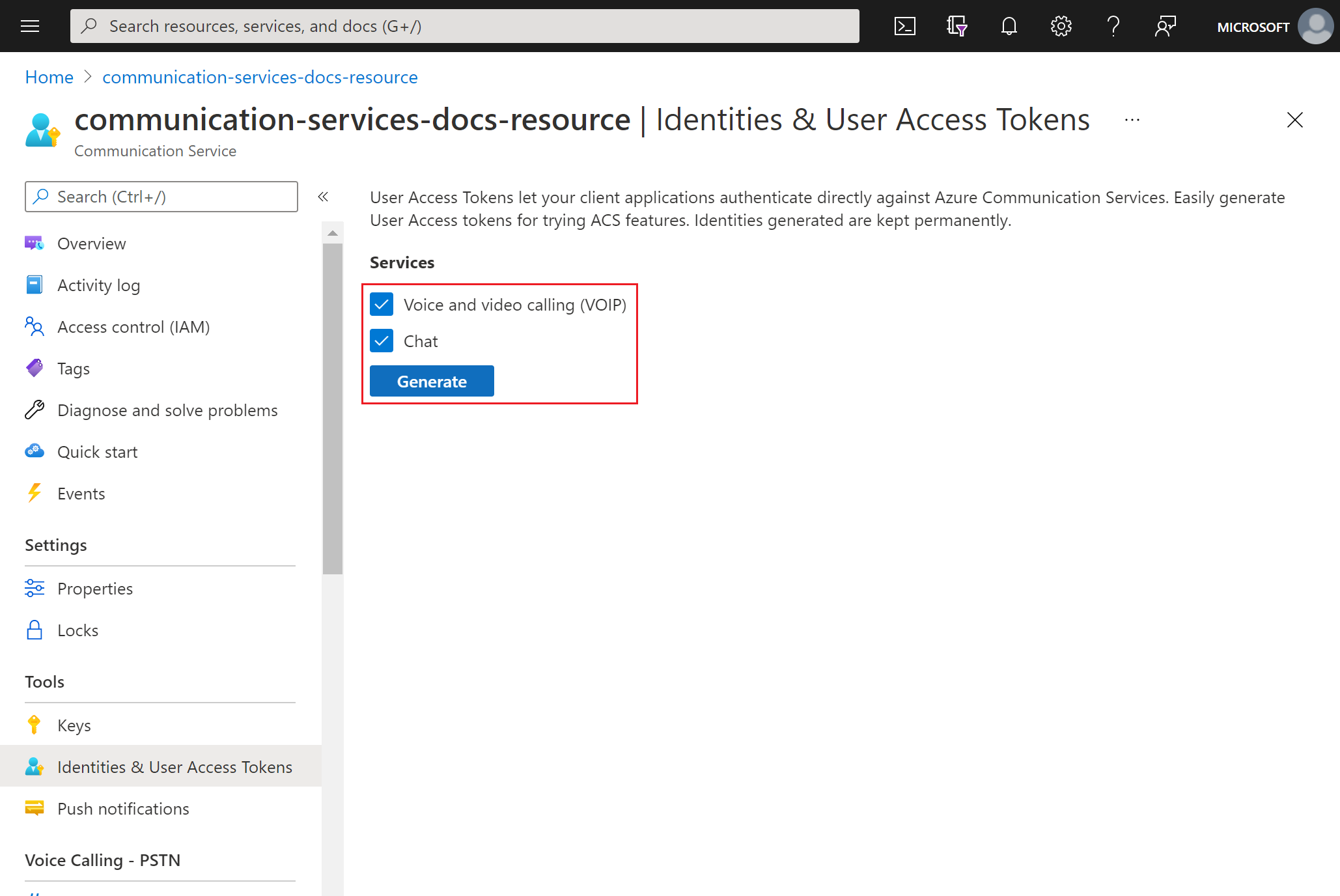 Dans le portail Azure, accédez au panneau Identités et jetons d’accès utilisateur dans votre ressource Communication Services.