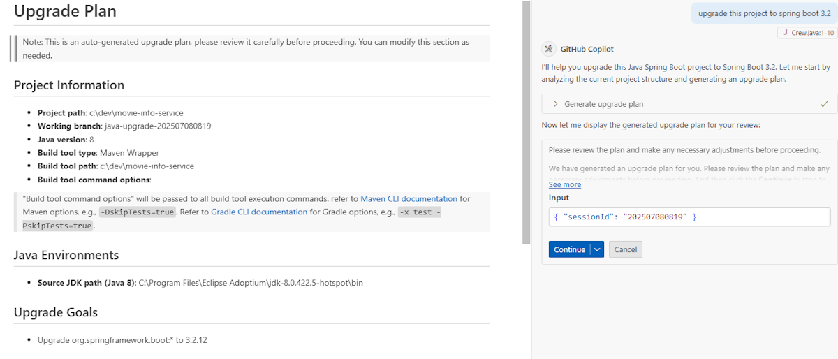 Si votre version de JDK actuelle est compatible avec la version Spring Boot spécifiée , par exemple, JDK 17+ pour Spring Boot 3.2 - l’outil effectue une mise à niveau uniquement du framework. Les versions JDK source et cible restent identiques et la version de Spring Boot cible est définie en fonction de votre invite initiale.