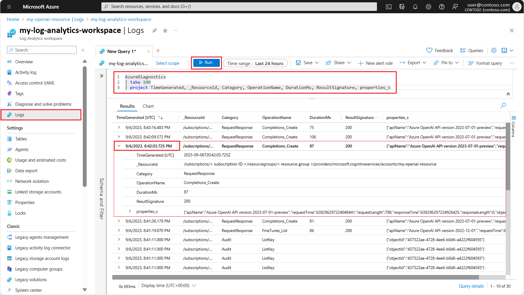 Après avoir configuré les paramètres de diagnostic, vous pouvez utiliser des métriques et des données de journal pour votre ressource Azure OpenAI dans votre espace de travail Log Analytics.